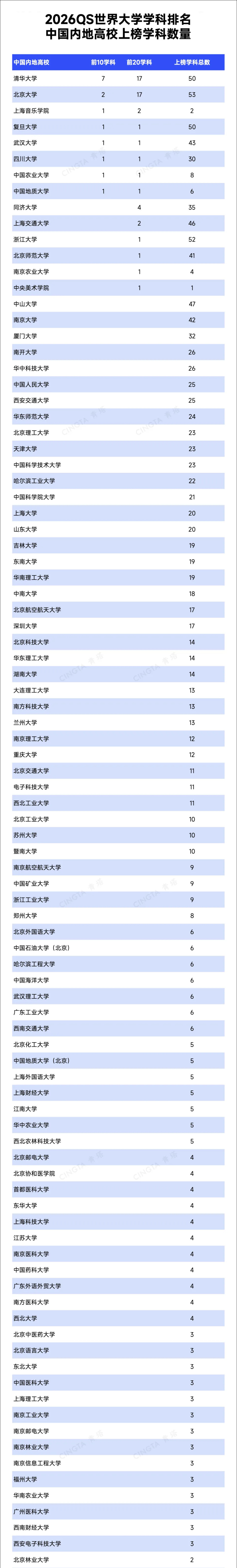 2026QS天下大学学科名次中国(内地)踏进大众前十的学科达15项,较2021年的7项增长逾一倍。清华大学领有7个大众前10学科,数目上领跑内地高校。