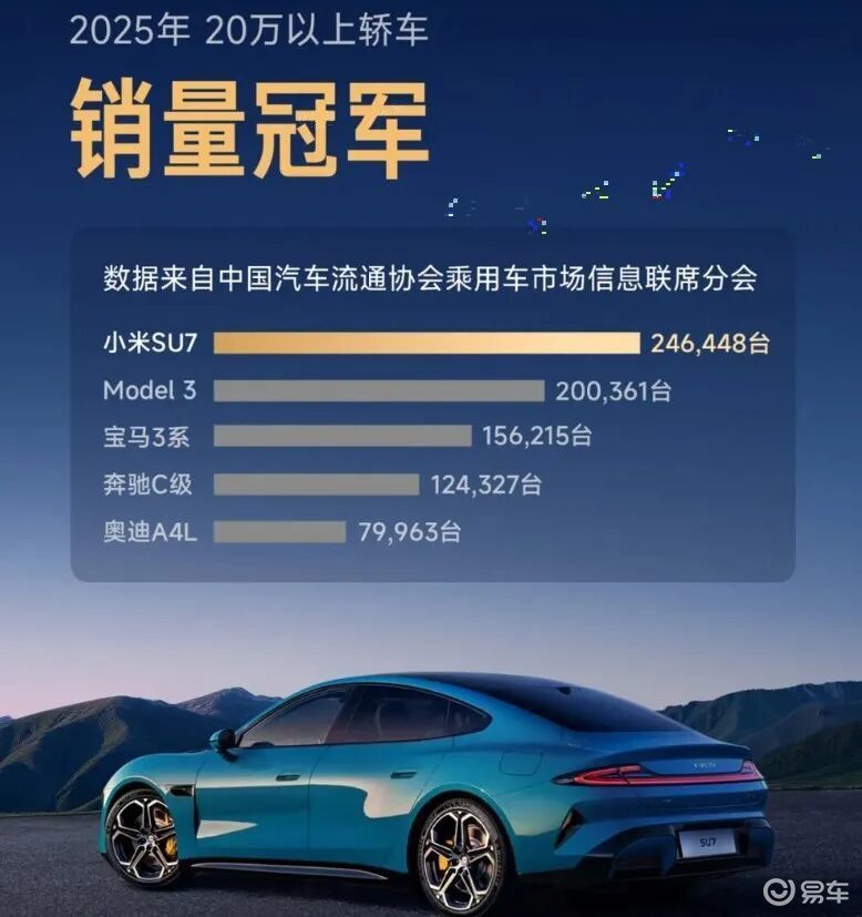 小米SU7力压Model 3、良马3系、奥迪A4L、驰骋C级,问鼎20万以上轿车销冠,YU7连续7个月位各国内中大型SUV销量第一。