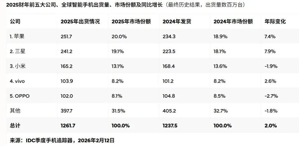 2025年公共前五的市占率分辨是,苹果20.0%、三星19.1%、小米13.1%、vivo 8.2%、OPPO 8.1%。显然,小米手机稳稳地站在第一梯队。