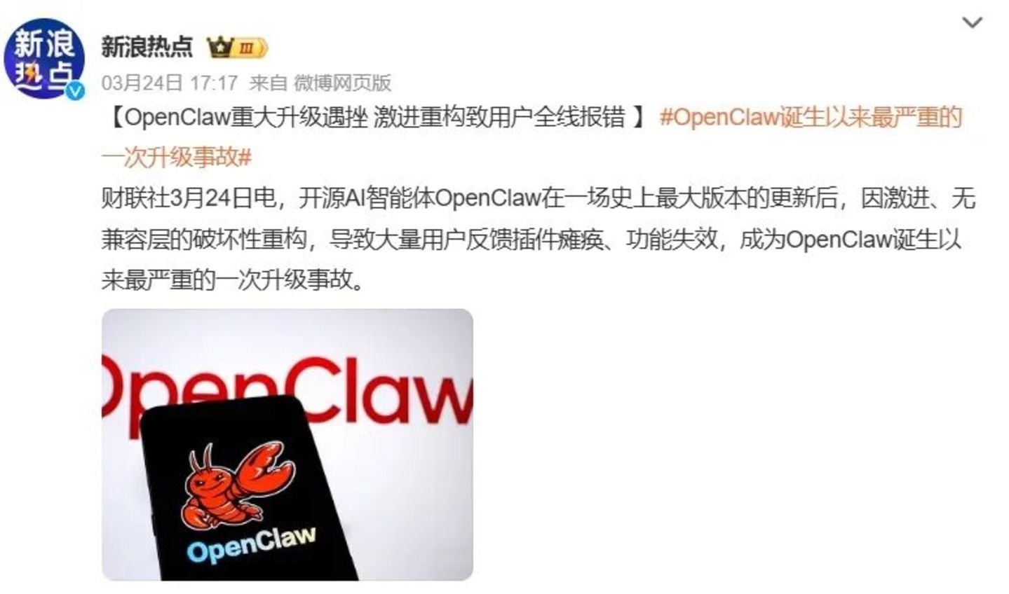 3月24日,Openclaw在一场史上最大版块的更新后,因激进、无兼容层的冒失性重构,导致精深用户反馈插件瘫痪、功能失效。一位资深科技从业者直言,向穷乏计议机安全基本学问的公众推论Openclaw装配,导缜密码泄漏、账户被盗等情况,是极其不负背负的行为;若是不作念好环境完毕,不宜在平日办公电脑上“养龙虾”。